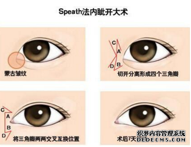 Speath法内眦开大术是将赘皮处皮肤切开分离形成四个三角瓣,再利用皮肤组织的松动性,将三角瓣两两交叉互换位置,使内眦点向内移位,缝合固定后达到开大眼角的效果。适应人群:适应于较严重的内眦赘皮,有去除赘皮及开大眼角需要者。